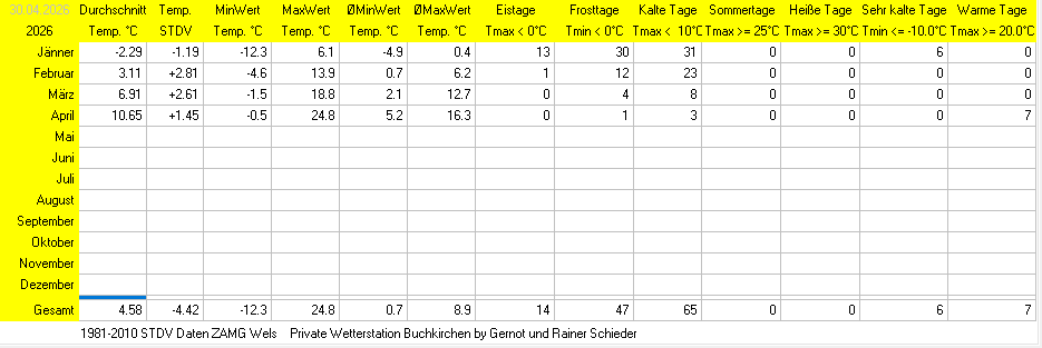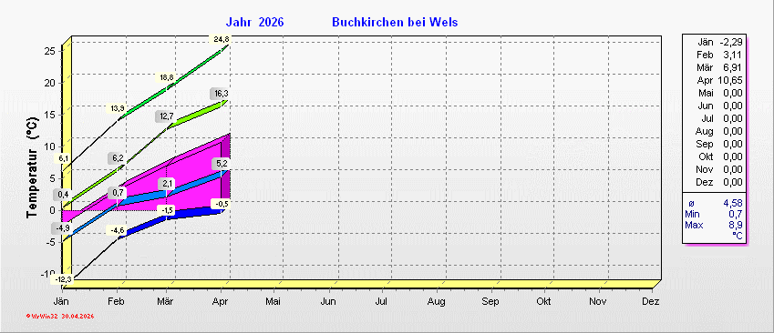 Erklärung zu den Diagrammen: Dunkelgrün = Tmax, Hellgrün = durchnittliche Tmax, Hellblau = durschnittliche Tmin, Dunkelblau = Tmin, Lila = Durschnittstemperatur